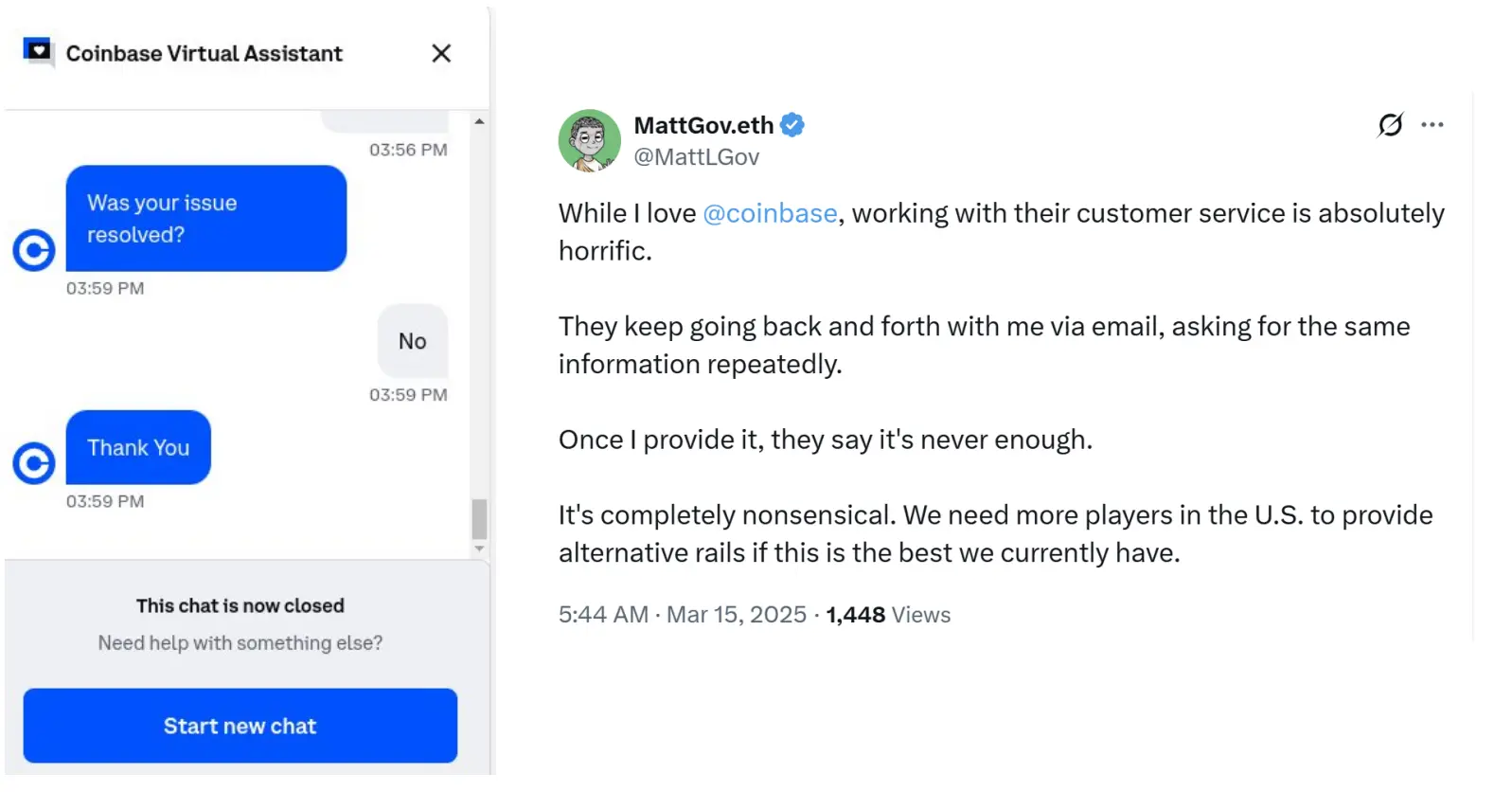 此外,部分使用者稱其客服溝通機制混亂低效。「他們一直通過電子郵件來回向我索取同樣的資訊,我提供了,他們又說不夠。」使用者 @MattLGov 表示,「與 Coinbase 客服打交道絕對是件可怕的事。」