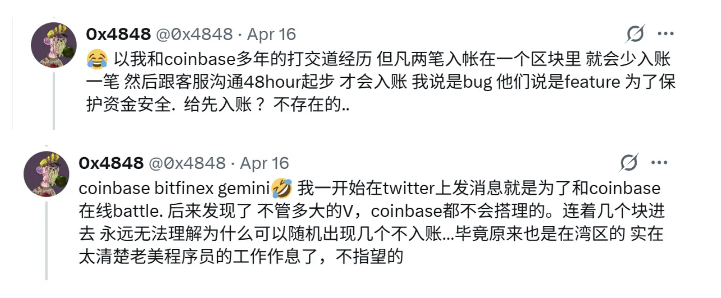 有使用者回饋稱,當兩筆交易在同一區塊中處理時,Coinbase 系統可能只入帳一筆,另一筆則需耗費幾天與客服拉鋸,才得以恢復。使用者 @0x4848 表示:「我說是 bug,他們說是 feature,為了保護資金安全。」