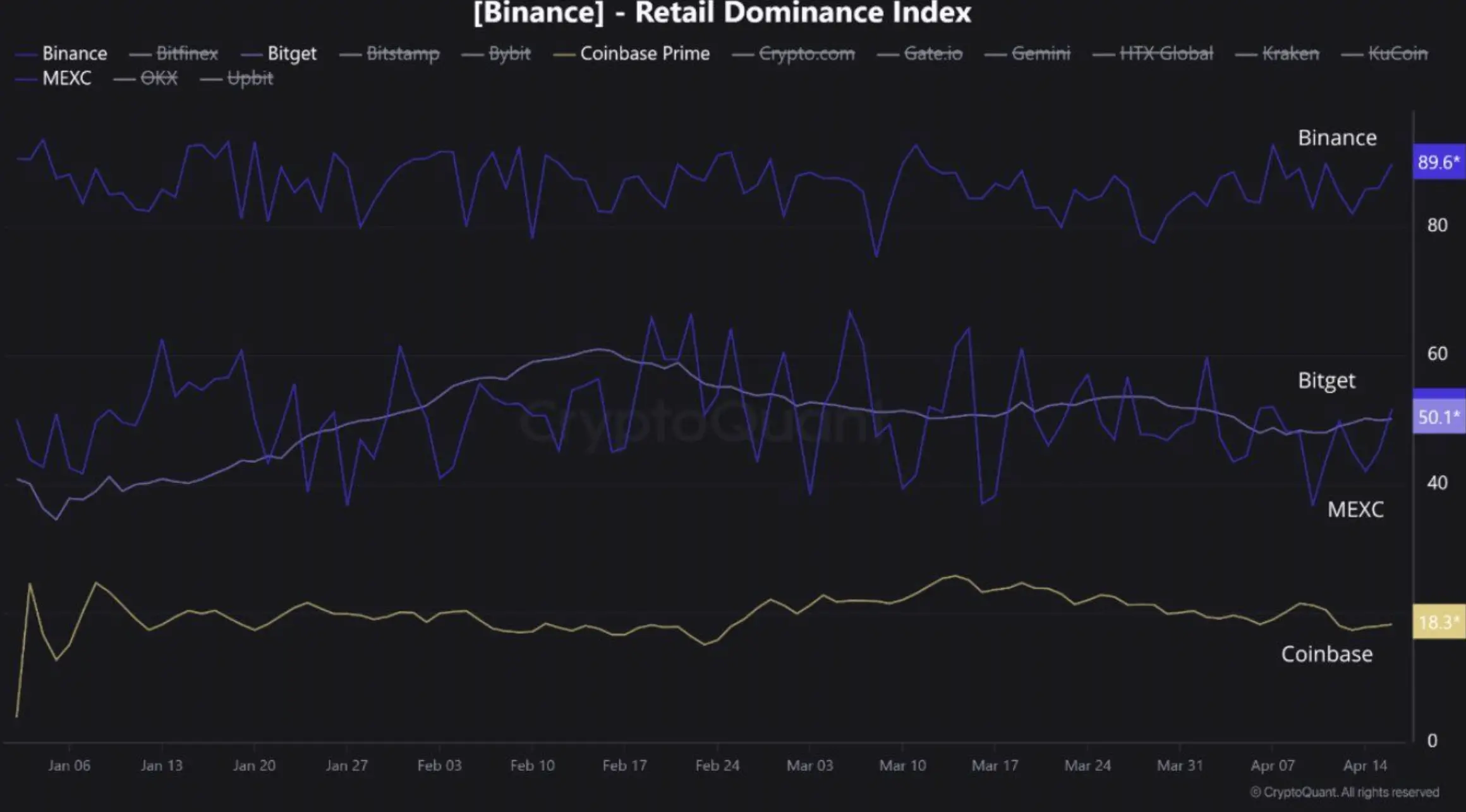 據 CryptoQuant 資料顯示,Coinbase 的個人投資者主導指數僅為 18.3%,遠遠低於 Binance 的 89.6% 和 Bitget 的 50.1%。這項指數反應了交易所中個人投資者相對於機構投資者的活躍程度和影響力,數值越高,表示使用者群體中個人投資者佔比越大。