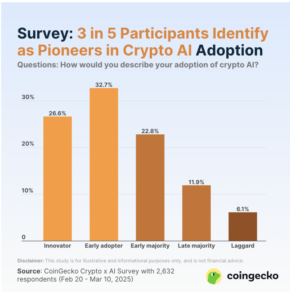 在今年進行的一項調查中,59.3% 的加密行業參與者(接近五分之三)認為自己是加密 AI 的「第一批採用者」。另有 34.7% 的參與者將自己歸為加密 AI 應用的「主流使用者」,而剩下的 6.1% 則是對加密 AI 採納意願最低的「懷疑者」。