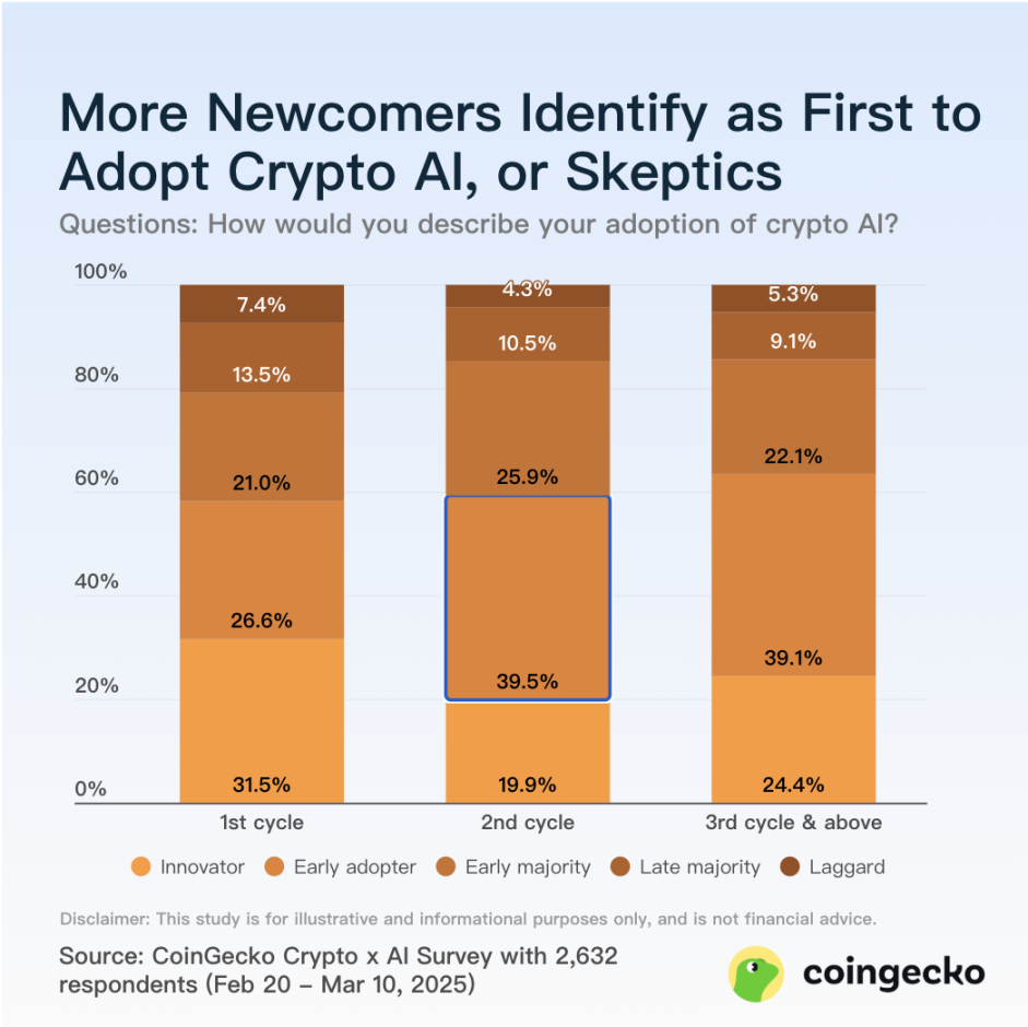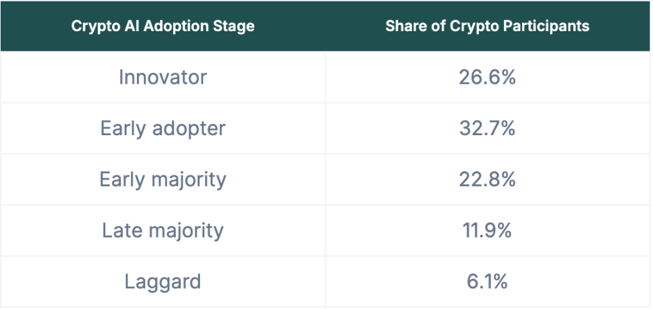 值得注意的是,在首次經歷市場週期的參與者中,31.5% 將自己定義為加密 AI 應用的「創新者」,而 7.4% 則認為自己是「落後者」。