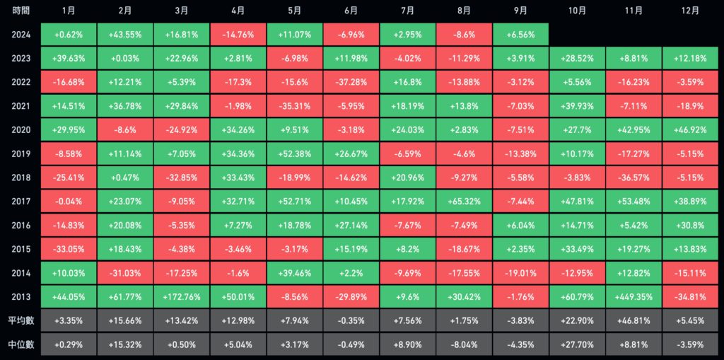 動區此前曾報導,回顧比特幣在過去 11 年(2013 – 2023)裡的月度回報率,比特幣通常在 9 月的表現不佳,其中出現 8 次下跌,下跌機率高達 73%;同時從每月回報率平均數來看,9 月也是下跌最多的月份,幅度高達 4.78%。