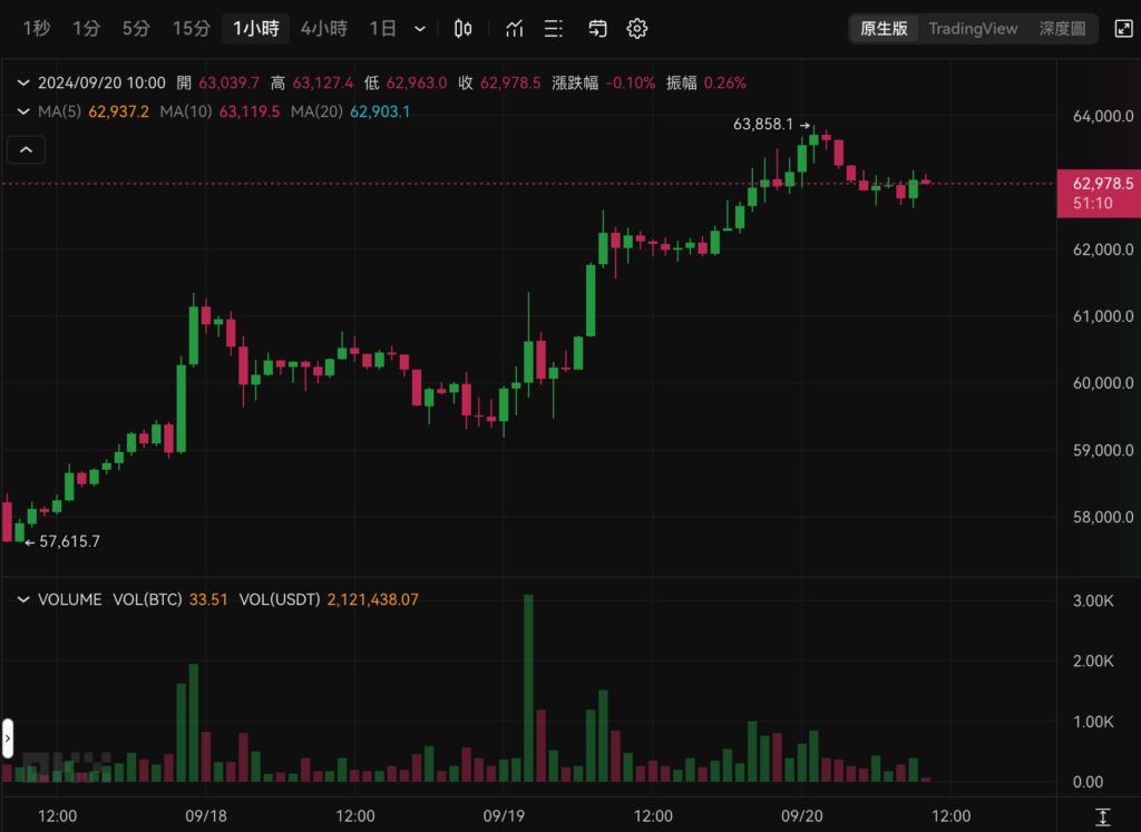 昨日聯準會正式宣布加息 2 碼之後,比特幣經過短暫震盪後持續走高,今(20)晨午夜一點多,BTC 最高觸及 63,858 美元,持續刷新九月新高。
