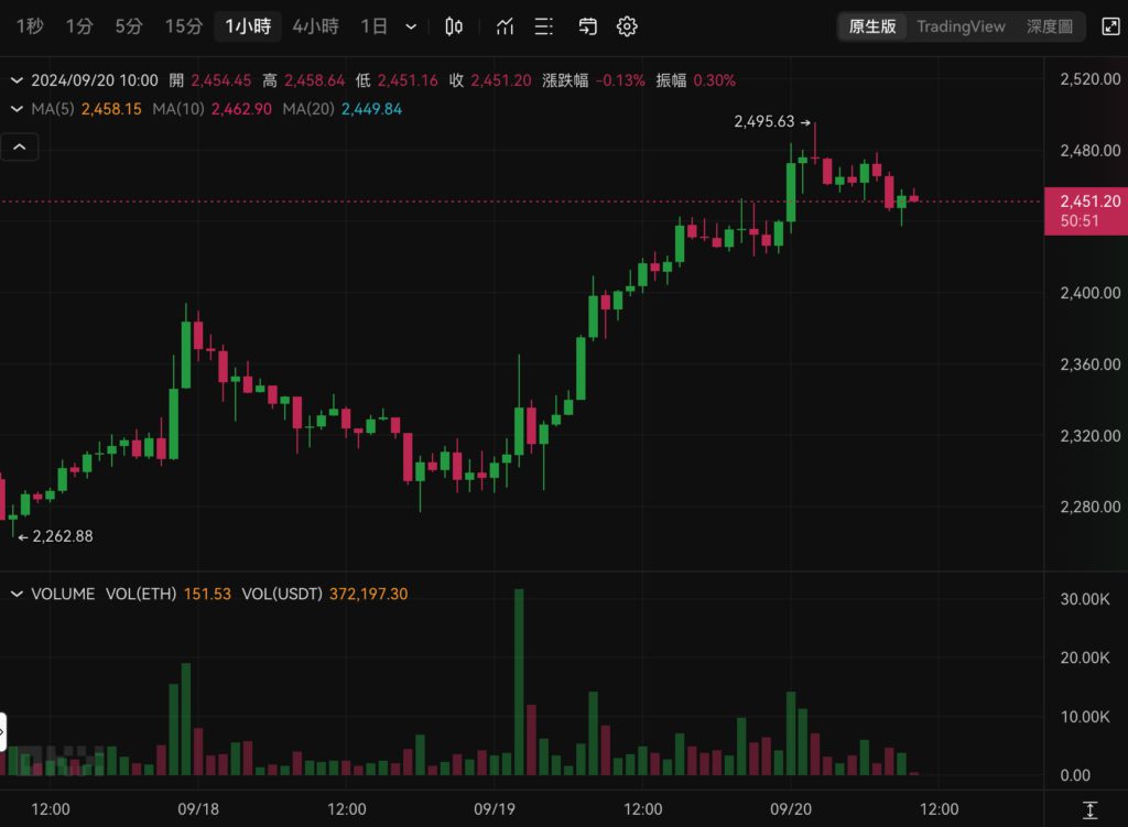 以太坊部分走勢與比特幣雷同,午夜一度來到 2,495 美元。撰稿當下暫時回落到 2,451 美元,近 24 小時漲幅縮窄至 2.46%。