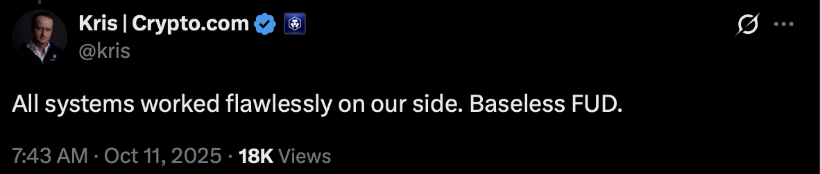 這波 FUD 最先在幾個加密聊天群竄出,指稱「Wintermute 爆倉,Crypto.com 提現延遲」。兩家公司橫跨造市與交易環節,任何負面揣測都可能觸發系統性風險,因此訊息一出,相關價格立刻出現異動。