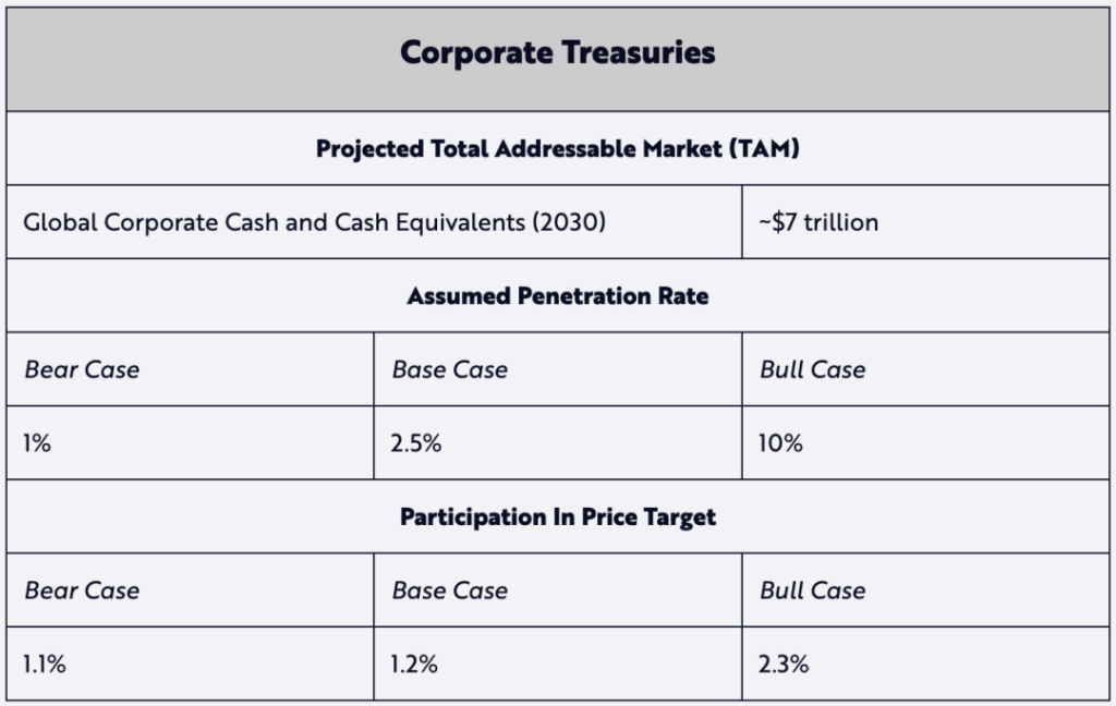 受 Strategy(微策略)公司自 2020 年以來成功購入比特幣的啟發,其他公司也紛紛將比特幣納入其企業財庫儲備。截至 2024 年底, 74 家上市公司的資產負債表上持有約 550 億美元的比特幣。如果這些企業 BTC 戰略在未來六年內被證成功,那麼我們在熊市和基準情景下的保守滲透率假設(分別為 1% 和 2.5% )最終可能會接近於牛市假設下的 10% 。