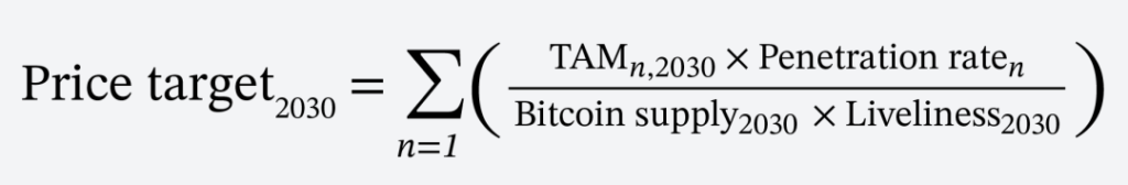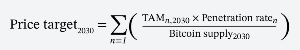 Odaily 星球日報注:該公式通過量化市場需求和比特幣流通的動態關係來預測 2030 年比特幣的價格。通過細分市場的最大美元基準需求規模與比特幣在其市場的滲透率相乘並除以比特幣的流通供應量得出比特幣價格,並將所有細分市場(以下細分市場 / 概念)的價格求和得出比特幣在 2030 年的預測價格。