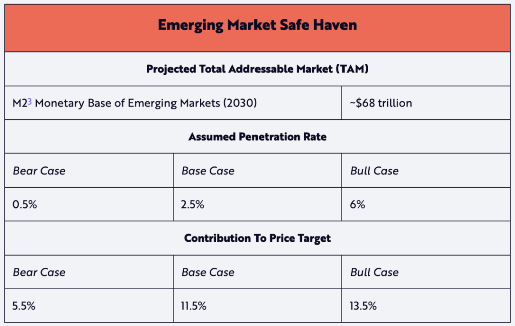 新興市場避風港 TAM 基於所有發展中國家(根據 IMF/CIA 的定義,也稱為 「非發達」 經濟體)的貨幣基礎。我們認為,比特幣的這一用例具有最大的資本增值潛力。除了其價值儲存特性外,比特幣的低門檻還為擁有網際網路的個人提供了一種投資選擇,這種投資選擇可能會隨著時間的推移帶來資本增值,與美元等防禦性配置不同 —— 從而保持購買力並避免本國貨幣貶值。