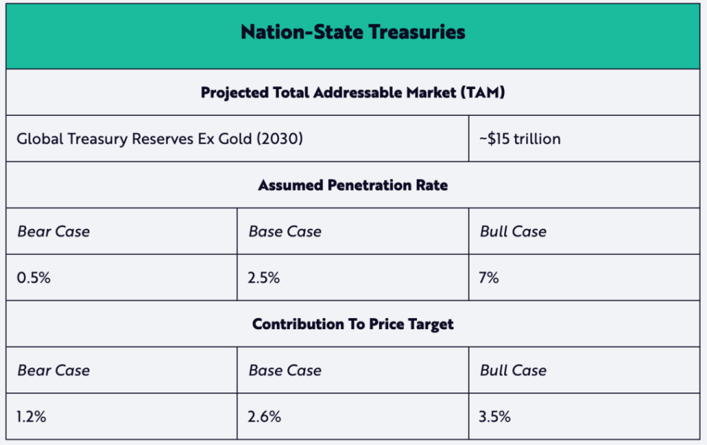 雖然薩爾瓦多和不丹目前在國家層面比特幣採用率方面領先全球,但比特幣戰略儲備的倡導者正在日益增多 —— 尤其是川普上任後,他於 3 月 6 日釋出了一行政命令,要求在美國建立 BTC 儲備。儘管我們的熊市假設和基準假設較為保守,但我們相信,美國的情況或許能夠進一步驗證我們牛市假設中 7% 的滲透率。