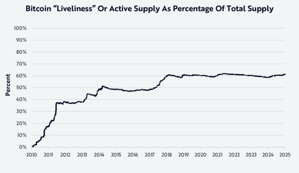 如圖所示,自 2018 年初以來,比特幣的網路活躍度一直保持在 60% 左右。我們認為,這種程度的活躍度表明約 40% 的供應量是 「vaulted」(即儲存不進入市場的比特幣,比如中本聰的比特幣地址)—— 我們在 ARK 白皮書《Cointime Economics:比特幣鏈上分析的新框架》(https://www.ark-invest.com/white-papers/cointime-economics) 中深入探討了這一概念。