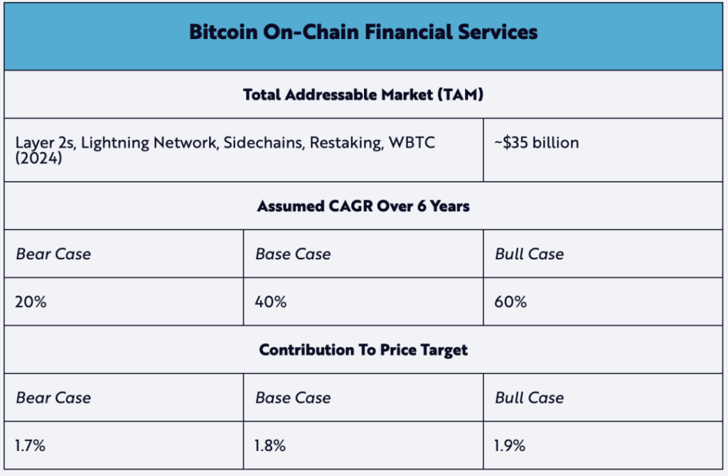 比特幣的原生金融服務正在成為資本積累的新興貢獻者。其中突出的例子包括:像閃電網路這樣的 Layer 2 服務致力於擴展套件比特幣的交易容量,而以太坊網路上的 Wrapped BTC(WBTC)則使比特幣能夠參與去中心化金融。此類鏈上金融服務正成為比特幣生態系統中日益重要的特徵。因此,我們認為,從現在到 2030 年,基準市場 40% 複合年增長率是基於現實情況下的預期。