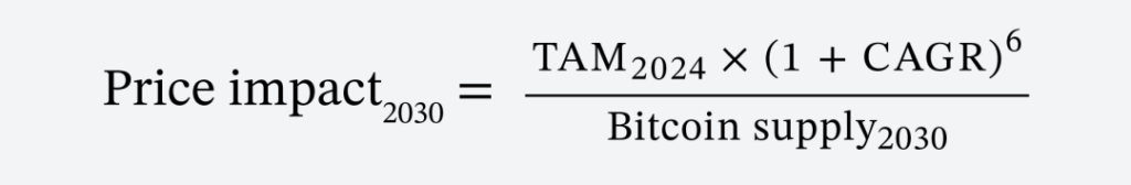 Odaily 星球日報注:該公式通過 2024 年比特幣總價值與每年的複合增長率來計算 6 年後的比特幣 TAM,並除以比特幣 2030 年流通供應量來計算其價格。
