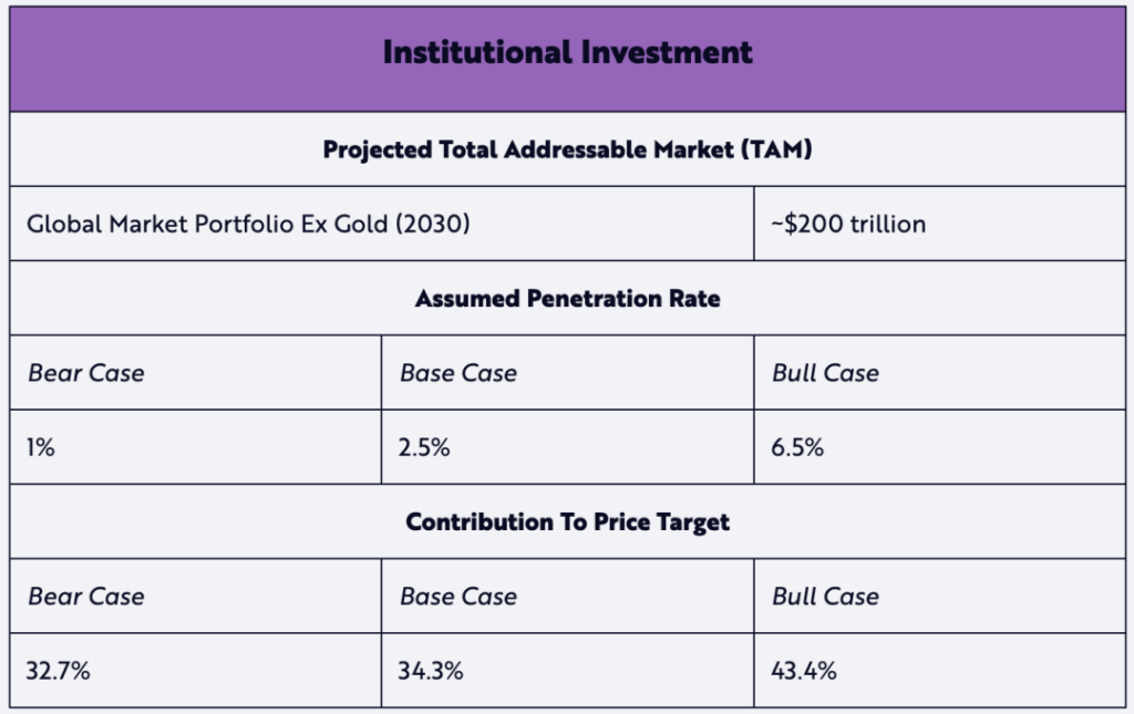 截至 2024 年,全球投資組合的 TAM 約為 169 兆美元(不包括黃金 3.6% 的份額)。假設其年複合增長率為 3% ,則到 2030 年其價值將達到約 200 兆美元。
