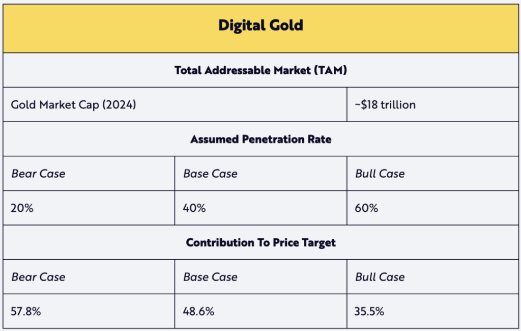數位黃金的貢獻假設了 TAM 相對於黃金當前市值的比率。鑑於給出的積極的滲透率,我們假設黃金在 2030 年的預期 TAM 不會增長,從而降低其預期值。我們認為,比特幣作為數位黃金是一個有吸引力的敘事,這將推動其滲透率。