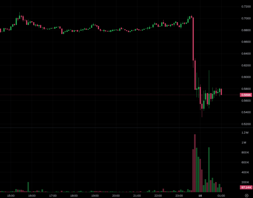 公告一出,$KAITO 代幣立即受到衝擊。$KAITO 短時從 0.7 美元附近急劇跌至接近 0.52 美元,撰稿當下略有回升,暫報 0.57 美元,近 24 小時跌幅高達 15%。
