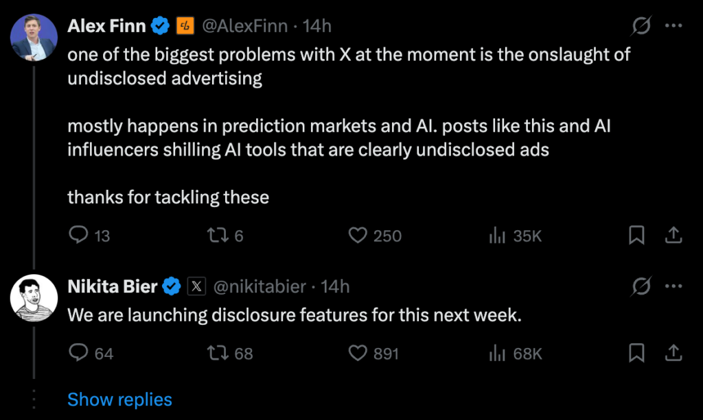 在同一貼文的討論中,另一位用戶 Alex Finn 指出:「X 目前最大的問題之一,就是未揭露的廣告氾濫。這在預測市場和 AI 領域尤其嚴重,很多 KOL 推薦 AI 工具的貼文,明顯就是沒標示的廣告。」