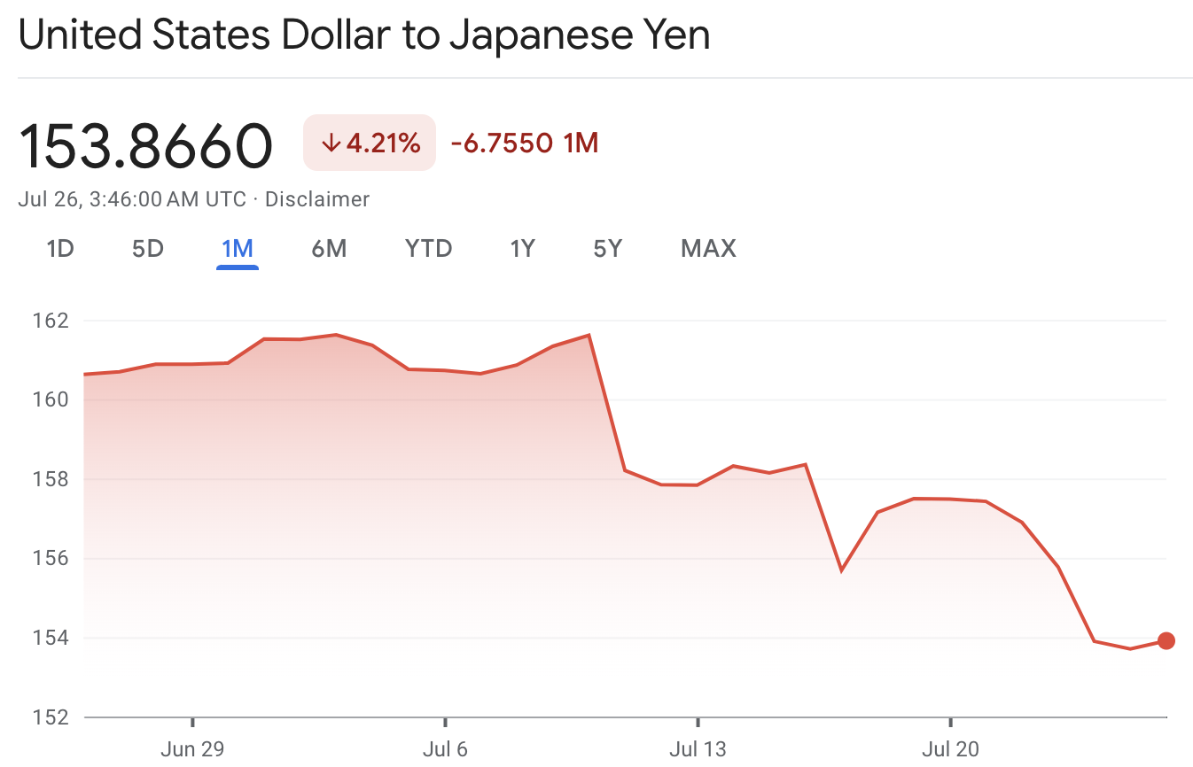 然而,根據彭博今日報導,日圓的這一快速升值趨勢可能在未來一周內見頂,並分析了市場對於日本央行可能於 7 月 31 日政策會議時升息的預期。目前,日圓兌美元已從高點略有回落,截稿前報 153.866日圓。