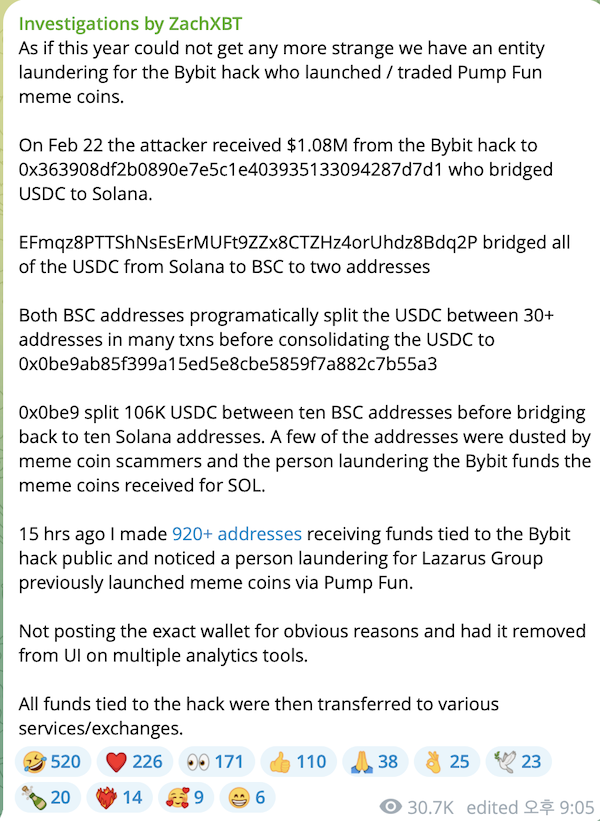 根據 ZachXBT 在 Telegram 的最新貼文,目前有一個實體透過在 Pump.fun 發行/交易迷因幣的方式,為 Bybit 駭客洗錢。