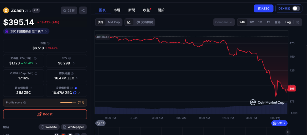 受到這場治理風暴的衝擊,Zcash 原生代幣 ZEC 在過去 24 小時內下跌近 20%,據 CoinGecko 數據顯示,目前交易價格約為 395美元,